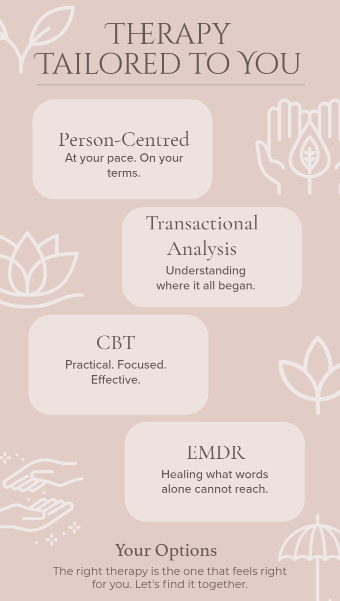 Whatever the approach, the most important part of any therapy is the relationship between therapist and client. That connection is always at the centre of the work we do together.